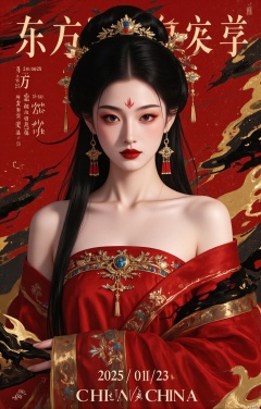 1girl, solo, long hair, breasts, looking at viewer, blue eyes, hair ornament, dress, bare shoulders, jewelry, upper body,  earrings, lips, see-through, makeup, chinese clothes, forehead mark, realistic, red lips,Red, Black and Gold Tone,Chinese characters, Chinese architecture,red poster