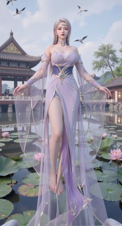 SFW,(masterpiece:1.2),best quality,1girl,solo,long hair,long dress,celestial maiden in flowing tulle gown levitates above lotus pond, ethereal mist trails from hair ribbons, mythical Penglai paradise emerges through clouds with glowing pavilions, translucent bioluminescent lotus blooms, flock of cranes gliding over water surface, ultra HD with soft 3D rendering, morning light filters through mist, falling petal rain, intricate details on scale-patterned fabric and lotus veins.(huge breasts:2.99),(full breasts:2.99),XliumeiY