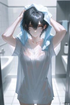 1girl,solo,looking at viewer,short hair,bangs,shirt,black hair,holding,hair between eyes,closed mouth,standing,collarbone,white shirt,short sleeves,signature,blurry,arms up,wet,grey eyes,blurry background,towel,wet clothes,drying,drying hair,bathroom