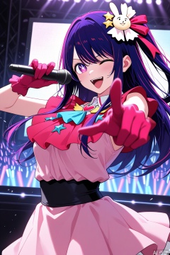 microphone, one eye closed, gloves, holding microphone, hair ornament, smile, pink dress, open mouth, idol, pointing, pointing at viewer,
