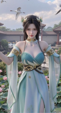 SFW,(masterpiece:1.2),best quality,1girl,solo,long hair,long dress,celestial maiden in flowing tulle gown levitates above lotus pond, ethereal mist trails from hair ribbons, mythical Penglai paradise emerges through clouds with glowing pavilions, translucent bioluminescent lotus blooms, flock of cranes gliding over water surface, ultra HD with soft 3D rendering, morning light filters through mist, falling petal rain, intricate details on scale-patterned fabric and lotus veins.(huge breasts:2.99),(full breasts:2.99),XliumeiY
