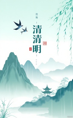 QMJ, Digital art in a traditional Chinese style, featuring a serene landscape with misty mountains, a small temple in the distance, and a large, stylized tree with drooping branches on the right. The sky is a gradient of light blue and white, with soft, falling rain. Two birds are flying in the sky, and a few white flowers are blooming in the foreground. The text in the center is written in Chinese characters and reads "Qing Ming 4/4." The overall color palette is soft and calming, with shades of blue, white, and green.