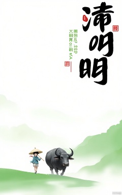 QMJ, Digital illustration, traditional Chinese art style, featuring a serene landscape with a young girl wearing a conical hat and carrying a bamboo pole walking alongside a large black water buffalo. The girl is dressed in simple, traditional clothing with a blue top and white pants. The background showcases a misty, pale green and white gradient, evoking a sense of tranquility and natural beauty. Chinese characters are prominently displayed in the upper portion of the image, with the date "2022.05.04" and additional text in red and green. The overall composition is balanced, with the girl and buffalo positioned centrally, conveying a peaceful rural scene.