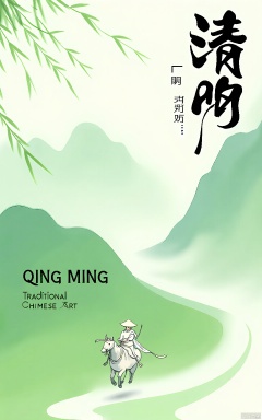 QMJ, Digital art in a traditional Chinese style, featuring a lone horseman riding through a serene landscape. The rider is dressed in a simple, traditional outfit with a conical hat, riding a horse with flowing reins. The background is a lush, green landscape with rolling hills and a winding river. The sky is pale blue with soft, wispy clouds. The title "QING MING" is prominently displayed in bold, black calligraphy at the top right, with the subtitle "Traditional Chinese Art" in smaller text below. The artwork is framed by delicate, light green bamboo leaves at the top and bottom edges.