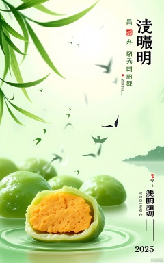 QMJ, A vibrant, digital illustration in a traditional Chinese style, featuring a large, green dumpling with an orange filling, placed in the center. Surrounding the dumpling are water droplets and a few green leaves. In the background, a small boat is seen on a calm lake, with birds flying in the sky. The text "2025" and Chinese characters are at the bottom right. The top left corner has the text "DAI" with a small red seal. The color palette is primarily green and orange, with a serene, natural ambiance.