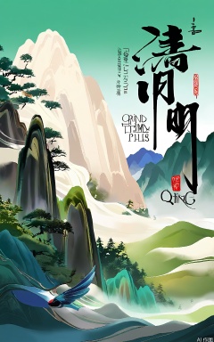 QMJ, A digital painting of a serene mountain landscape with mist and waterfalls, featuring two birds in flight, one with wings fully spread and the other mid-flight, both with long tails. The mountains are lush with greenery and there are tall pine trees scattered throughout. The sky is a soft gradient of blues and whites, blending into the mist. The overall color palette is cool with shades of green, blue, and white. The title "SPRING" is prominently displayed at the top in large, elegant green letters, with additional Chinese characters below it. The scene is tranquil and picturesque.