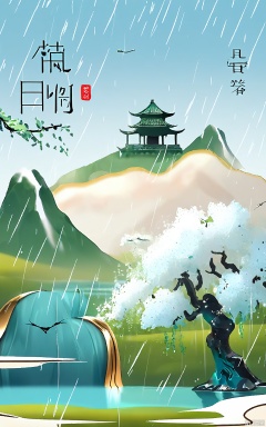 QMJ, Digital art in a traditional Chinese style, featuring a serene landscape with misty mountains, a small temple in the distance, and a large, stylized tree with drooping branches on the right. The sky is a gradient of light blue and white, with soft, falling rain. Two birds are flying in the sky, and a few white flowers are blooming in the foreground. The text in the center is written in Chinese characters and reads "Qing Ming 4/4." The overall color palette is soft and calming, with shades of blue, white, and green.
