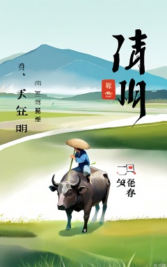 QMJ, Digital illustration, traditional Chinese art style, featuring a serene landscape with a young girl wearing a conical hat and carrying a bamboo pole walking alongside a large black water buffalo. The girl is dressed in simple, traditional clothing with a blue top and white pants. The background showcases a misty, pale green and white gradient, evoking a sense of tranquility and natural beauty. Chinese characters are prominently displayed in the upper portion of the image, with the date "2022.05.04" and additional text in red and green. The overall composition is balanced, with the girl and buffalo positioned centrally, conveying a peaceful rural scene.