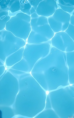SBW, Photograph of a clear, bright blue swimming pool with rippling water, taken from above. The water creates a dynamic pattern of light and shadow, with reflections of the pool's edge and sky. The pool is empty, and the lighting is natural, suggesting a sunny day. The image captures the serene and refreshing atmosphere of a swimming pool, emphasizing the contrast between the vibrant blue water and the lighter, clouded sky reflections. The water's texture appears smooth, with gentle waves creating a sense of movement.