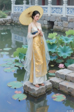 The full body image of classical oil paintings, Asian beauty stands on the rock steps of the lotus pond with an oil paper umbrella, and the golden horse's face skirt reflects the ripples of water. The blue and white porcelain pattern railings appear in the background blur, and the trajectory of rain wire is presented by transparent dyeing techniques.