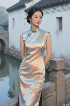 Realistic oil painting bust, Asian woman wearing Suzhou embroidered cheongsam stands on the stone bridge in the water town, satin fabric is shiny in the morning light, classical hairpins are inserted into jade hairpins, background atomization is reflected in the outline of black tiles and white walls