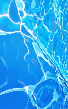 SBW, Photograph of a clear, bright blue swimming pool with rippling water, taken from above. The water creates a dynamic pattern of light and shadow, with reflections of the pool's edge and sky. The pool is empty, and the lighting is natural, suggesting a sunny day. The image captures the serene and refreshing atmosphere of a swimming pool, emphasizing the contrast between the vibrant blue water and the lighter, clouded sky reflections. The water's texture appears smooth, with gentle waves creating a sense of movement.