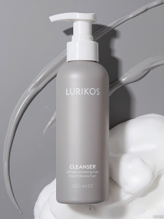 PMCJ, A photograph of a sleek, modern, minimalist skincare product packaging. The product is a "Lurikos" "Cleanser" with "Clay Exfoliating Foam." The bottle is a frosted, light grey color with a white cap and a white pump dispenser. The background features a smooth, flowing, grey "clay" texture, with a white, foam-like substance on the right side. The text on the packaging is clean and elegant, with the brand name "Lurikos" at the top. The overall aesthetic is clean, sophisticated, and luxurious.