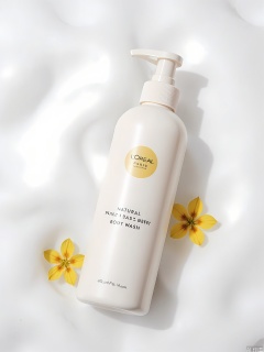 PMCJ, A bottle of natural plant-based body wash, labeled "L'Oréal Paris" with a yellow circular logo, placed on a surface covered with white foam bubbles. The bottle is white with a pump dispenser and the text "Natural Plant-Based Body Wash" on the label. Surrounding the bottle are small yellow flowers, adding a touch of color. The background is a soft, white, frothy texture, suggesting a spa or shower setting. The image is bright and clean, with a minimalist aesthetic.