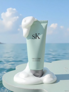 PMCJ, A photograph of a light mint green tube of skincare product, labeled "SK-II," with a white, fluffy, whipped cream-like substance spilling over its top and sides. The tube is placed on a pale green, irregularly shaped surface, with more of the whipped cream substance scattered around it. The background features a clear blue sky with fluffy white clouds, and a serene, calm body of water at the bottom, creating a peaceful, tranquil atmosphere. The image is bright and airy, with a soft, pastel color palette.
