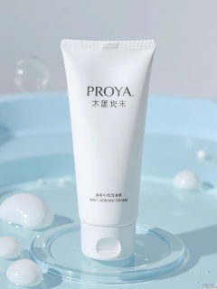 PMCJ, A photograph of a white, cylindrical tube of Proya skincare cream, with a label that reads "Proya Anti-Aging Cream" in English and Chinese. The tube is standing upright in a shallow pool of water, with bubbles and ripples around it, giving a fresh and clean aesthetic. The background is a blurred, light blue gradient, enhancing the focus on the product. The lighting is soft and natural, highlighting the purity of the product. The overall style is minimalist and modern, emphasizing the product's effectiveness and freshness.