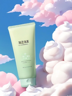 PMCJ, A photograph of a light mint green tube of skincare product, labeled "SK-II," with a white, fluffy, whipped cream-like substance spilling over its top and sides. The tube is placed on a pale green, irregularly shaped surface, with more of the whipped cream substance scattered around it. The background features a clear blue sky with fluffy white clouds, and a serene, calm body of water at the bottom, creating a peaceful, tranquil atmosphere. The image is bright and airy, with a soft, pastel color palette.