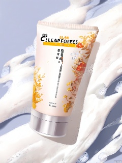 PMCJ, A photograph of a skincare product, specifically a cream, with a modern and minimalistic design. The product is housed in a sleek, gray tube with a silver cap. The label is in both English and Chinese, featuring the brand name "COS" and the product name "Clean pores & less oil." The background is a textured, white fabric, with subtle, overlapping bubbles scattered across it. The lighting is soft and diffused, creating a clean and professional aesthetic. The overall style is contemporary and sophisticated, emphasizing the product's high-quality and effective nature.