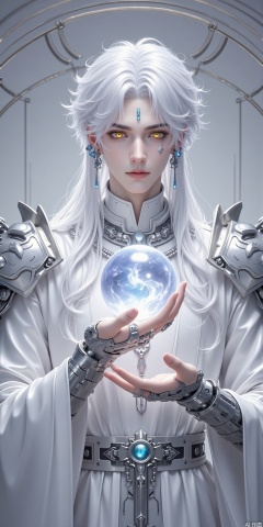 solo, long hair, looking at viewer, hair ornament, long sleeves, 1boy, holding, jewelry, closed mouth, yellow eyes, upper body, white hair, male focus, earrings, belt, indoors, wide sleeves, armor, mole, lips, ring, shoulder armor, robe, orb, white robe