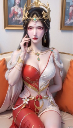 zichu-hongdie, "This image depicts a charming woman, a full body shot of her, with long black hair, a golden crown on her head, a green gem in the middle, she has red eyes and delicate makeup, red and white eyeshadows and dark red lips, Wearing a beautifully crafted red and white outfit and a red and white dress. The skirt covers the entire legs, the clothes come with intricate patterns and exhaustively designed accessories