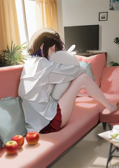 1girl, solo, short hair, bangs, skirt, brown hair, shirt, black hair, long sleeves, sitting, closed eyes, white shirt, pleated skirt, food, barefoot, day, indoors, feet, legs, bare legs, window, hug, fruit, red skirt, stuffed toy, sunlight, stuffed animal, plant, curtains, couch, bowl, object hug, apple, potted plant, on couch, television, picture frame