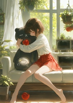 1girl, solo, short hair, bangs, skirt, brown hair, shirt, black hair, long sleeves, sitting, closed eyes, white shirt, pleated skirt, food, barefoot, day, indoors, feet, legs, bare legs, window, hug, fruit, red skirt, stuffed toy, sunlight, stuffed animal, plant, curtains, couch, bowl, object hug, apple, potted plant, on couch, television, picture frame