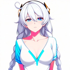 masterpiece, best quality,solo,(white background:1.2),simple background,1girl,looking at viewer, game_cg_style, kiana kaslana,k423,ponytail,long braid,braided ponytail,symbol-shaped pupils,white hair,twin braids,braid,silver hair,hair between eyes,ahoge,bangs,long hair,blue eyes,breasts,hair ornament,eyebrows visible through hair<lora:K423-ILL:0.8>