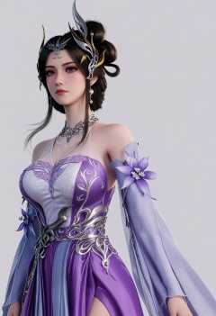 score_9,high detail,best quality,cinematic lighting,volumetric lighting,shiny skin,shiny,1girl,solo,blue eyes,white background,dress,hair ornament,jewelry,expressionless,closed mouth,purple dress,large breasts,black hair,flower,earrings,detached sleeves,bare shoulders,hair bun,simple background,realistic,looking_at_viewer,thighs,<lora:QQSponybaixueV1:0.8>,<lora:Pony_DetailV2.0:0.8>,<lora:皮肤凹痕:0.1>,