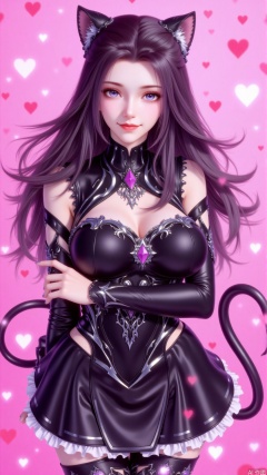 The image depicts a stylized, anime-inspired character with long, flowing dark hair. The character is adorned with black cat ears and a black outfit that features intricate silver designs and a prominent gemstone on the chest. The background is a vibrant pink, filled with scattered white and red hearts, creating a romantic and whimsical atmosphere. The character's expression is calm and confident, with a slight smile and direct gaze.