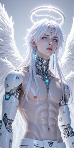 solo, long hair, looking at viewer, bangs, blue eyes, 1boy, jewelry, closed mouth, upper body, white hair, male focus, earrings, wings, necklace, lips, parted bangs, eyelashes, glowing, halo, expressionless, gem, feathered wings, topless male, angel wings, white wings, angel, mechanical arms, cyborg, robot joints