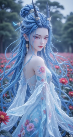 aorun,baoshi,lvjing,1girl,solo,long hair,red eyes,horns,dress,blue hair,1girl,solo,jewelry,earrings,blurry,chinese clothes,blurry background,flower,hair ornament,hanfu,long sleeves,floral print,hair bun,outdoors,looking at viewer,single hair bun,wide sleeves,closed mouth,makeup,collarbone,day,standing,red flower,cover,simple background,gradient_background,Close-up details,outstanding style,adding a touch of dimension to your images without compromising details,close-up,