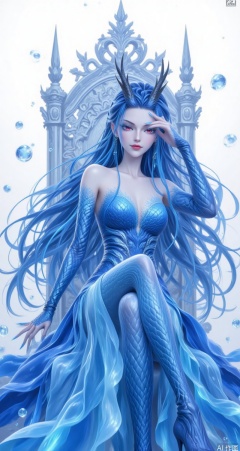 baoshi,lvjing,aorun,1girl,solo,long hair,red eyes,horns,dress,blue dress,deep blue dress,high heels,full body,blue hair,white background,bare shoulders,1 one hand on his head,looking at viewer,boots,thighhighs,thigh boots,blue eyes,blue footwear,simple background,high heel boots,cover,simple background,gradient_background,Close-up details,outstanding style,adding a touch of dimension to your images without compromising details,close-up,chair,sit down,underwater,throne,bubble,