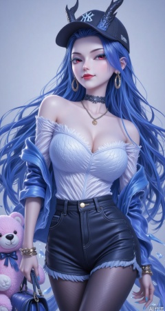 baoshi,lvjing,aorun,1girl,solo,long hair,red eyes,horns,dress,blue hair,1girl,jewelry,breasts,earrings,shorts,bag,pantyhose,large breasts,necklace,off shoulder,hat,choker,stuffed toy,stuffed animal,teddy bear,cleavage,solo,looking at viewer,jacket,bare shoulders,short shorts,stairs,see-through,handbag,bracelet,baseball cap,black shorts,hoop earrings,nipples,black pantyhose,shirt,denim shorts,collarbone,cutoffs,frills,black headwear,closed mouth,denim,white shirt,black choker,lips,cover,simple background,gradient_background,Close-up details,outstanding style,adding a touch of dimension to your images without compromising details,close-up,absurdres,
