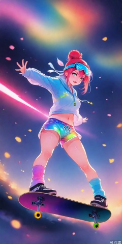 Sporty style 2D girl, high-tie bun with luminous sports headband, navel-exposed sweatshirt with holographic reflective strips, gradient laser shorts with piled socks, skateboard suspended cherry blossom special effect, neon street background acceleration line light effect, translucent goggles reflect rainbow light