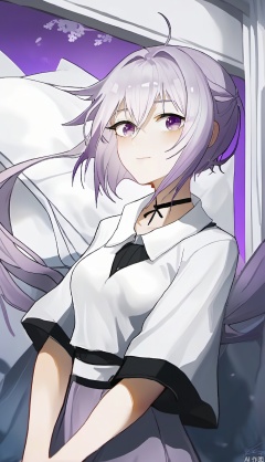 (sj),1girl,female_solo, white background,simple background, short hair,16-year old girl,slender,white hair,forehead,side lock,SFW,upper_body, blush, short hair, shirt, closed mouth, purple eyes, collarbone, upper body, ponytail, short sleeves, sweat, indoors, looking to the side, looking away, sunlight, short ponytail,
