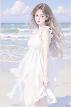 1girl, solo, long hair, looking at viewer, brown hair, dress, brown eyes, standing, outdoors, sky, day, water, white dress, ocean, beach,Oil Paintings by Nicolai Fechin,Fechin
