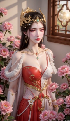 Beside the woman were lush and blooming pink flowers, surrounded by the wooden window lattice, and the sun shone through the window, creating a warm and dreamy atmosphere, as if setting off the woman as a fairy among flowers. The overall picture is full of classical beauty and romantic atmosphere.