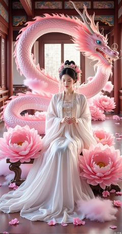 1girl, solo, black hair, hair ornament, long sleeves, dress, sitting, closed eyes, flower, indoors, hair flower, wide sleeves, hair bun, petals, window, chinese clothes, own hands together, pink flower, robe, dragon, architecture, hanfu, eastern dragon, reflective floor