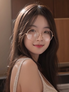 1girl,round eyewear,highres,realistic,highres,<lora:lora-000008.by_tusi:0.8>,looking at viewer,smile,photo,Volumetric Lighting,Cinematic Lighting,photo_(medium),reality,depth_of_field,upper_body,<lora:QYpifuV1:0.2>,<lora:Flux洗图神器:0.2>,
