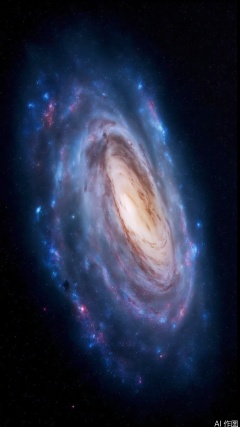 A high-resolution photo of the universe, the huge galaxy is like a dazzling vortex, with blue, purple and white rays intertwined. The center of the galaxy is a bright core surrounded by rotating nebula and stars. The background is a deep and boundless dark starry sky, which makes people feel the vastness and beauty of the universe.