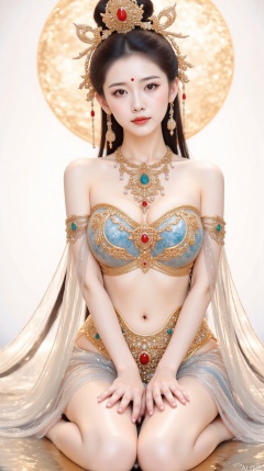 1girl,solo,long hair,breasts,looking at viewer,black hair,hair ornament,navel,bare shoulders,jewelry,sitting,earrings,necklace,hair bun,facial mark,forehead mark