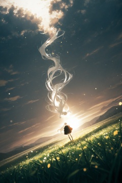 masterpiece,best quality,amazing quality,very aesthetic,absurdres,newest,extreme aesthetic,in the style of fashion photography,light particles,cinematic lighting,Visual impact,sharp focus,Emotionalization,depth of field,dutch angle,scenery,(dino_(dinoartforame):0.5),(yoneyama mai:0.5),(Yomu:0.3),happy to jump up,1girl,solo,white_hair,very long hair,scenery,single scene focus,in a meadow,grove,clouble,