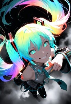 masterpiece,best quality,amazing quality,very aesthetic,absurdres,newest,impactful picture,offcial art,movie perspective,(aos:0.5),(fajyobore:0.5),(chiaroscuro:0.5),Hatsune Miku,limited palette,black background,colorful,vibrant,glowing outline,neon,blacklight,looking at viewer,fog,from_side,from_above,face focus,evil_grin,pointing,glowing_hair,brilliant brilliance,