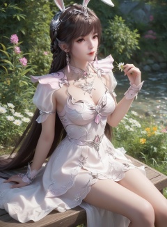 score_9,score_8_up,score_7_up,1girl,rabbit ears,animal ears,solo,long hair,dress,hair ornament,brown hair,brown eyes,thick_thighs,sitting,gaden,flower,<lora:wy_xiaowu_sz_XL7.0:0.8>,outdoors,