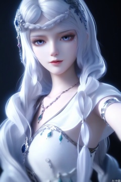 score_9,score_8_up,score_7_up,1girl,solo,looking at viewer,long hair,dress,hair ornament,jewelry,necklace,very long hair,braid,white hair,necklace,white dress,bracelet,portrait,pov,black background,simple background,3d
