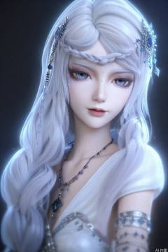 score_9,score_8_up,score_7_up,1girl,solo,looking at viewer,long hair,dress,hair ornament,jewelry,necklace,very long hair,braid,white hair,necklace,white dress,bracelet,portrait,pov,black background,simple background,3d