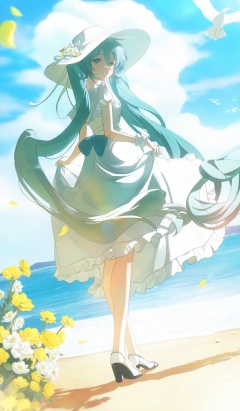 <lora:konya666 (5):1>,highres,absurdres,newest,very awa,masterpiece,best quality,year 2024,\,SenSen,1girl,hatsune miku,long hair,solo,outdoors,dress,bird,high heels,sky,aqua hair,very long hair,white headwear,flower,ocean,white dress,looking back,cloud,day,twintails,beach,looking at viewer,blue sky,aqua eyes,full body,standing,hat,smile,floating hair,white bird,frills,seagull,sunlight,frilled dress,bow,hair between eyes,skirt hold,horizon,short sleeves,sand,water,from behind,white flower,back bow,shadow,sun hat,cloudy sky,yellow flower,