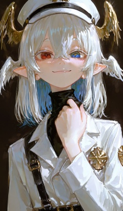 <lora:Taswell的SenSen画风:0.8>,highres,absurdres,newest,very awa,masterpiece,best quality,year 2024,(vanripper:1.2),yomiya_sateko,potg_(piotegu),void_0,(dino_(dinoartforame):0.8),(fkey:0.8),(yomu_(sgt_epper):0.8),(close-up:1.8),(upper body:1.5),cinematic lighting,god rays,ray tracing,reflection light,black background,1girl,solo,medium hair,hair between eyes,white hair,multicolored hair,braid,short eyebrows,(heterochromia:1.3),(Red left pupil:1.3),(blue right pupil:1.3),x-shaped_pupils,elf ears,flat chest,(head angel wings:1.3),(head wings:1.5),white Officer cap,turtleneck,white military jacket,black turtleneck,gold badge,black belt,black sheath dress,white knee boots,smile,(adjusting collar:1.1),