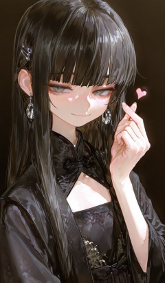 <lora:Taswell的SenSen画风:0.8>,highres,absurdres,newest,very awa,masterpiece,best quality,year 2024,(vanripper:1.2),yomiya_sateko,potg_(piotegu),void_0,(dino_(dinoartforame):0.8),(fkey:0.8),(yomu_(sgt_epper):0.8),(close-up:1.8),(upper body:1.5),cinematic lighting,god rays,ray tracing,reflection light,black background,1girl,loli,solo,long hair,blunt bangs,black hair,side swept bangs,Silver eyes,silver earrings,hair clip,Flat chest,plain clothes,(fine fabric emphasis:1.3),(black clothes:1.1),(black hanfu:1.1),(right lapel:1.3),long sleeves,black Plum dress pattern,red edging,pleated skirt,no socks,Chinese traditional shoes,light smile,(finger heart:1.1),