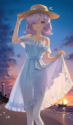 <lora:YoonYorry-Style:1.2>,(upper body:1.3),1girl,solo,curly hair,purple eyes,blue eyes,medium hair,hair over one eye,straw hat,Beige hair,Light purple hair,yellow hairpin,exposing shoulders,sky blue sundress,frilled dress,sky blue sandal,white pantyhose,fine fabric emphasis,bead bracelet,transparent clothing,anklet,harbor,beach,ocean,ship,shell,seashell,lighthouse,(touch hat:1.3),Lift skirt,Smoldering clouds,beautiful detailed sky,sky,cloud,night sky,starry sky,(sunset:1.1),chromatic aberration,lens flare,cinematic lighting,god rays,ray tracing,overexposure,backlighting,bokeh,smile,(crying with eyes open:1.1),(Tears of joy:1.2),looking at viewer,